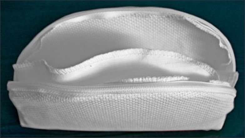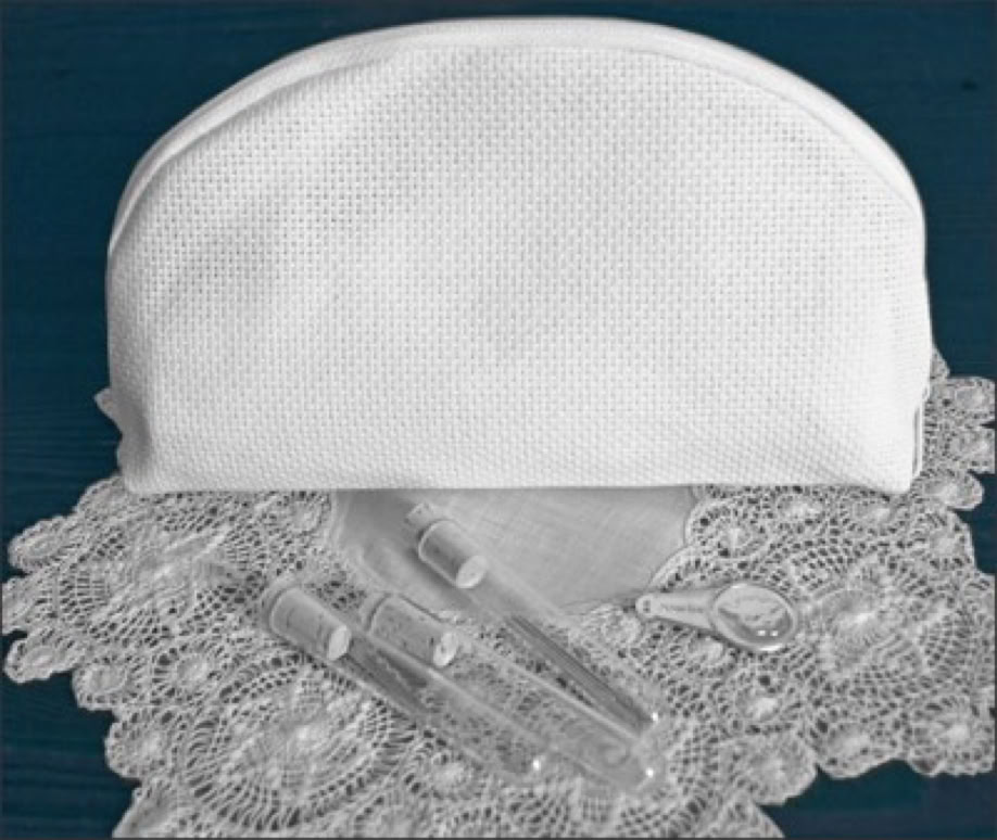 außen Aidastoff mit 7 Loch/cm, innen für das Futter ein Baumwolldamast, mit langem Reißverschluss.