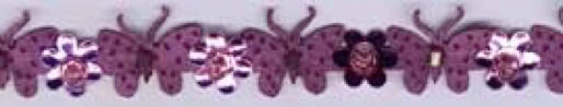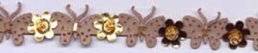 Die Schmetterlinge sind aus Bändchenmaterial gestanzt, dazwischen Blüten aus Metallfolie und je 1 Perle auf Blüte und Schmetterling genäht - sehr aufwändig gemacht!
