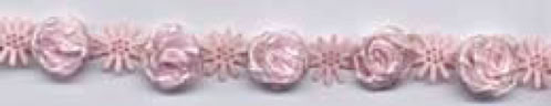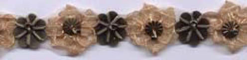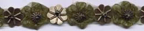 Blüten aus schmalem Organzaband gelegt, in der Mitte mit Metallpailette und Perlchen verziert und abwechselnd mit Metallblüte ( auch mit Perlchen in der Mitte) auf ein Organzabändchen genäht