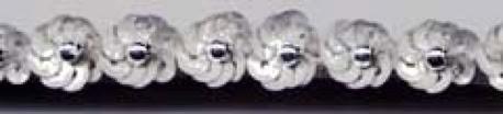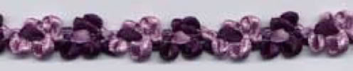 die Blüten sind aus 3 mm großen Minipailetten zusammengesetzt und haben in der Mittte eine kleine Perle; sie sind auf ein Organzabändchen genäht