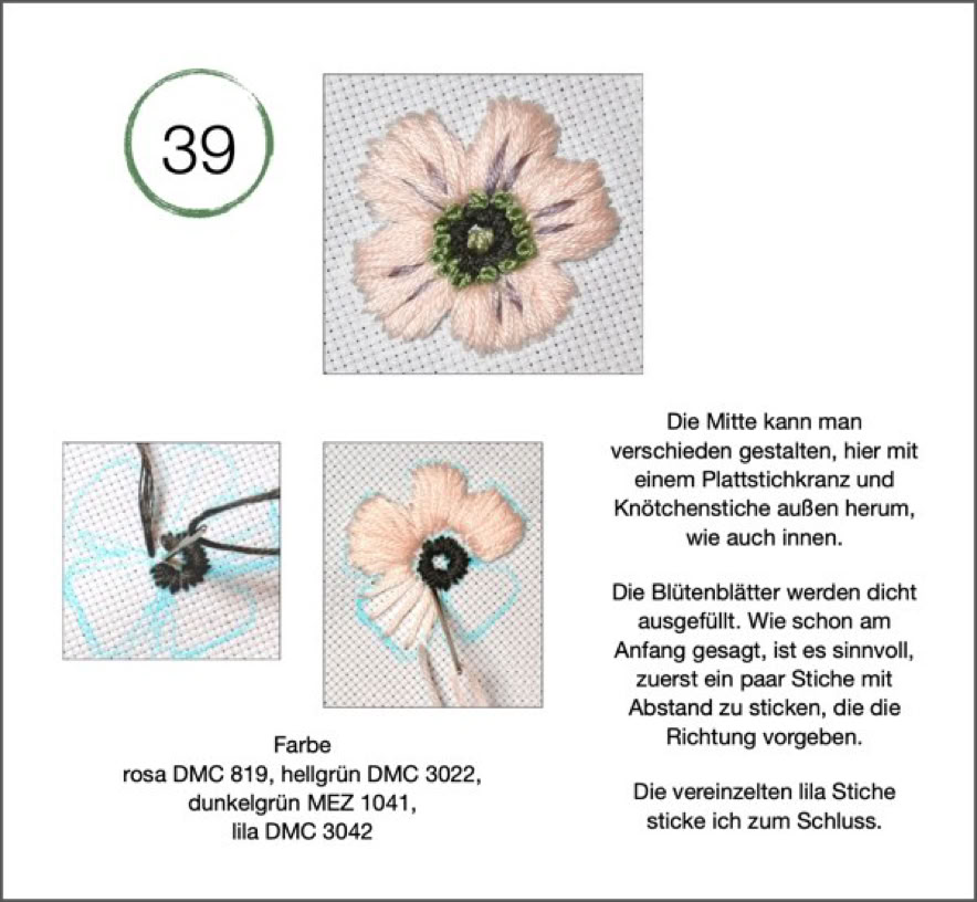 Diese Blumen sticke ich eher groß mit vollem faden Sticktwist, aber man kann sie natürlich auch klein sticken.