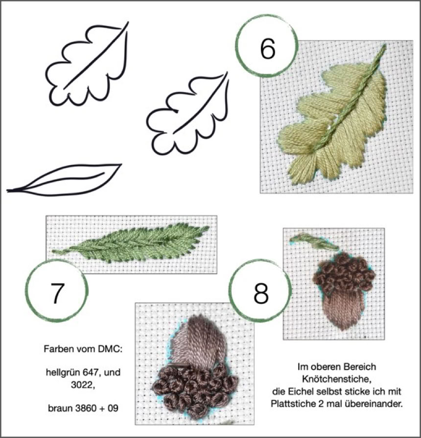 Von der Technik her: Diese Motive werden mit Bleistift oder einem wasserlöslichen Stift auf Stoff gezeichnet, durchgepaust oder abgebügelt und dann gestickt.