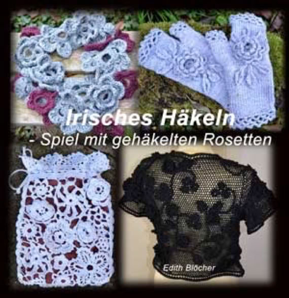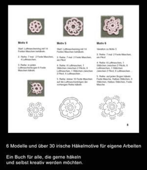 mit über 30 Häkelmotive für Rosetten und Blütenformen und dazu 6 Modelle, was man daraus machen kann.