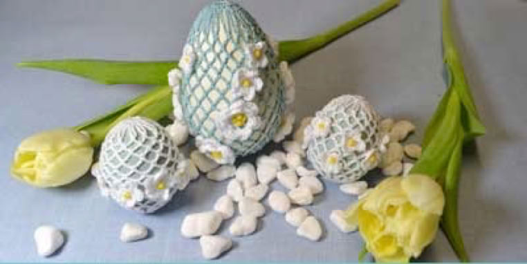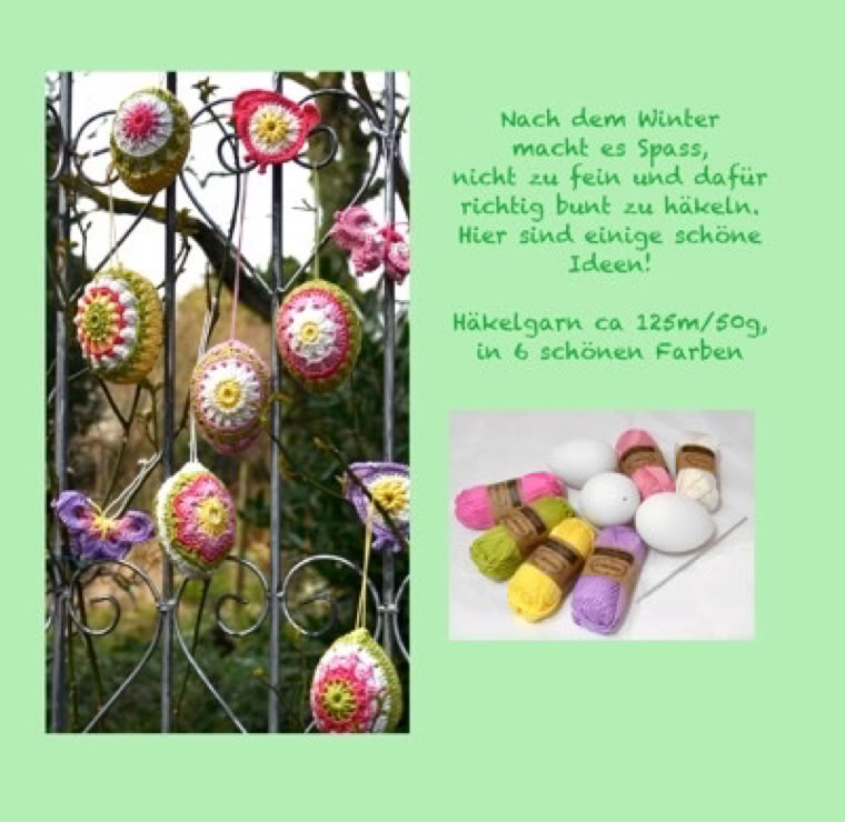 Inhalt sind dieausführlichen Anleitungen zu den hier gezeigten Eiern. Gehäkelt wurde mit Perlgarn 8 und Häkelnadel Stärke 1.0.