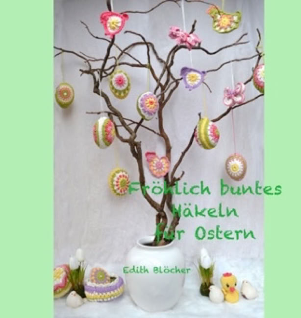Inhalt sind die Teile, die man auf dem Umschlag sieht: 9 verschiedene Ostereier, Häkelmotiv für Vögelchen, Hühnchen und Schmetterling
