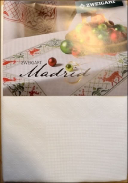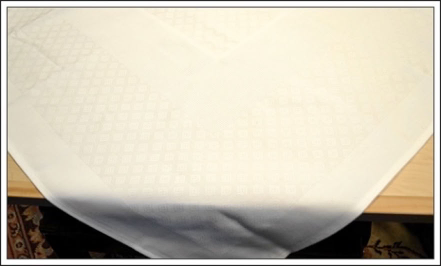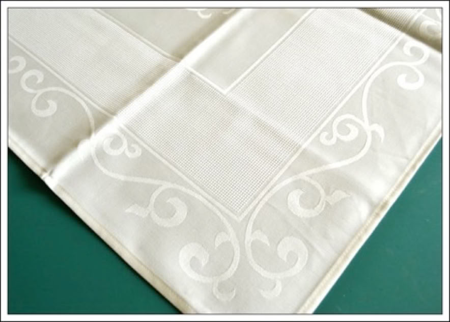 Eine Damastdecke mit wenig Glanz und eingewebten kleinen Karomotiven um den Aidarand herum.