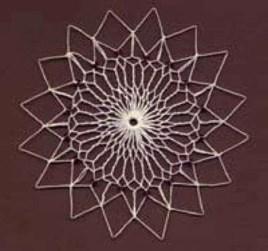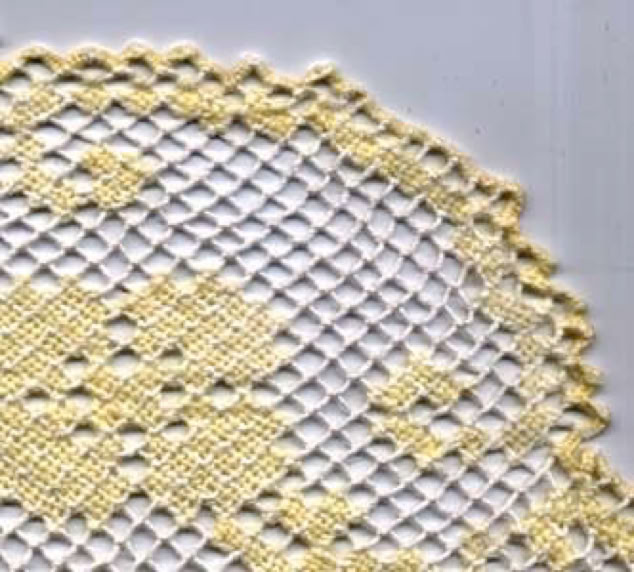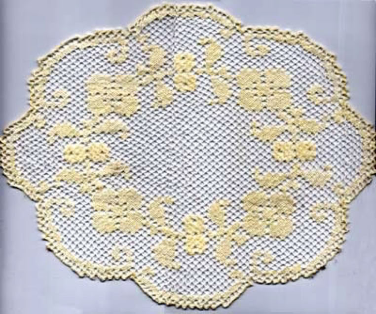 Die klassische Verwendung dieses Netzes sind Deckchen wie das in der Abbildung hier darunter. Zuerst wird das Netz geknüpft und dann ausgestickt.