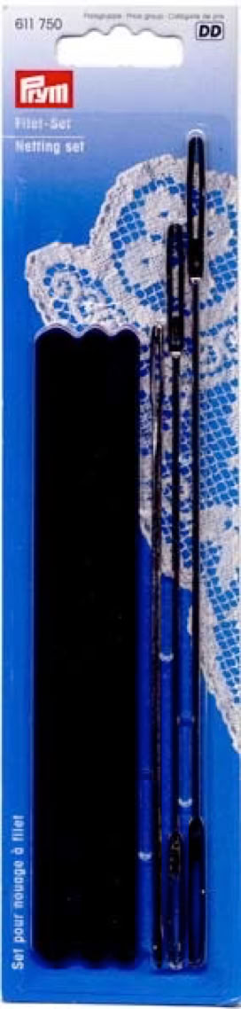 Hier links die Grundausrüstung zum Netzen - das Filetset von Prym mit verschieden breiten Stäbchen und 3 verschieden großen Garnhaltern.