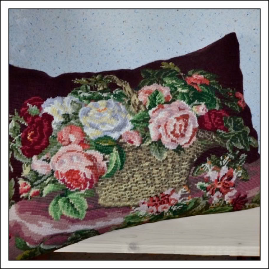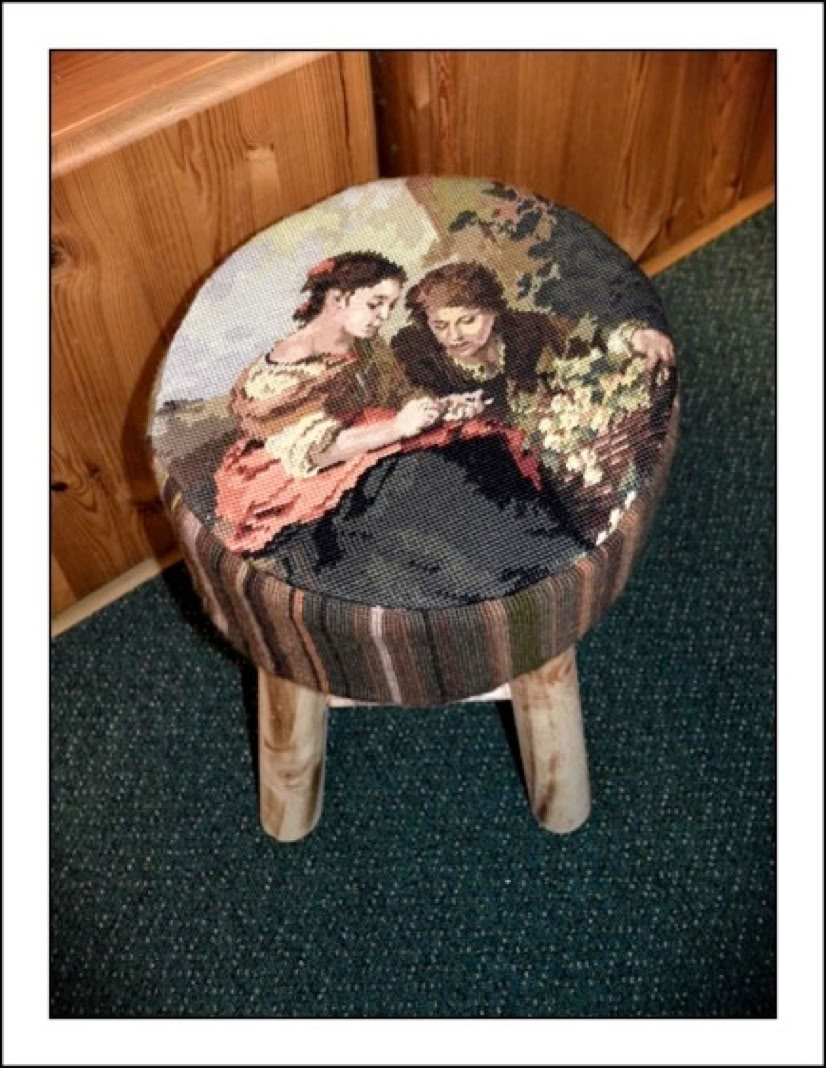 Hier rechts habe ich einen Schemel mit einem alten Gobelinbild bezogen. Den Streifen für den Rand habe ich neu in Streifen gestickt.
