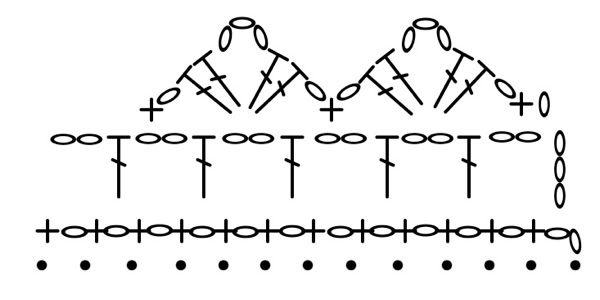 1 Feste Masche 5 Luftmaschen, 1 Feste Masche auf die 3. folgende Masche, also immer 2 Feste Maschen darunter auslassen. An den Spitzen in die 2 Luftmaschen 1 Feste Masche 5 Luftmaschen, 1 Feste Masche häkeln und in den Kerben die letzten und ersten 3 Maschen frei lassen und 4 Luftmaschen von einer Seite zur anderen häkeln.
