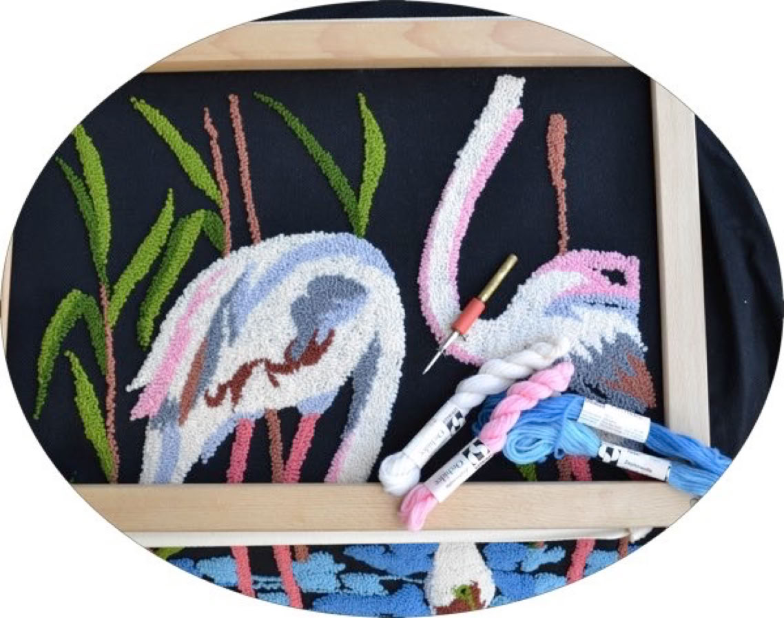 Hier links das Bild mit den Flamingos ist eine Punch Needle Arbeit aus den 70er Jahren. Ich habe das, was man hier sieht, in meiner Kindheit gemacht. Und jetzt nach über 40 Jahren habe ich den Wandbehang vollendet.