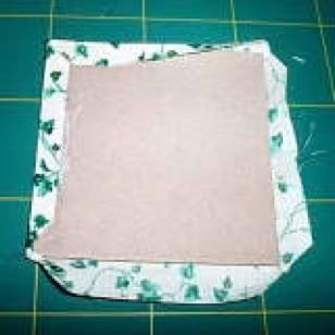 Die zweite Graupappe wird mit Stoff bezogen (Abb. links) und auf die untere Graupappe im Beutel geklebt. Darauf achten, dass nun alle Nahtzugaben zwischen den Pappen sind.. Das sieht im Beutel schön aus.