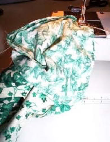 Nun werden die 50 cm langen Stoffstreifen zwei mal auf die Hälfte zusammengelegt und an der offenen Seite ca. 1 cm als Nahtzugabe stehen gelassen (Abb. links)
