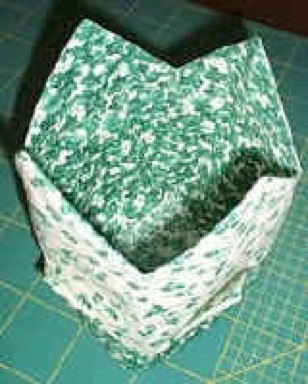 Jetzt werden die beiden Teile (das hohe und das niedrige Teil) übereinander gestülpt und der Boden durch alle 4 Lagen angenäht. Das ist der heikelste Teil der Arbeit und lässt sich nicht gut fotografieren.