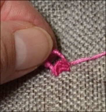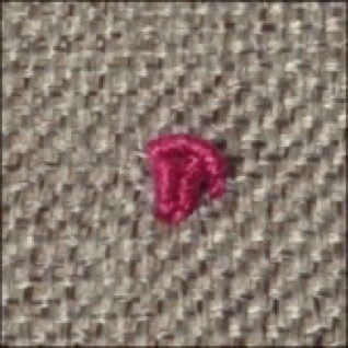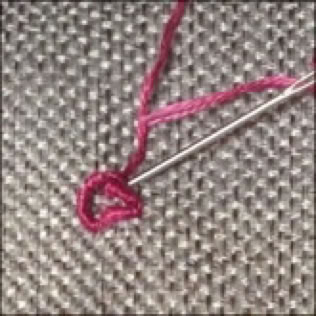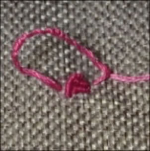 Am selben Punkt nach oden und wieder nach unten stechen. Zur Sicherung einen kleinen geraden Stich über die Schlaufe machen.