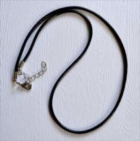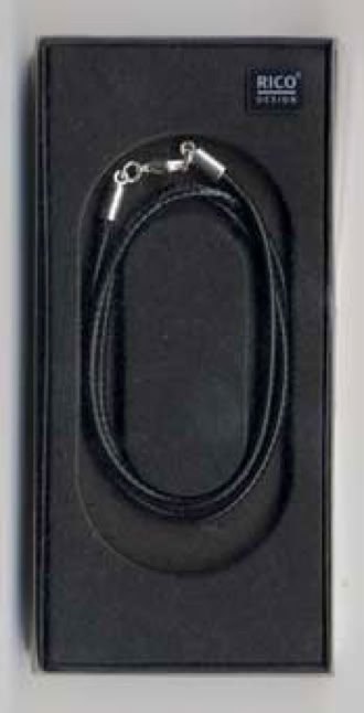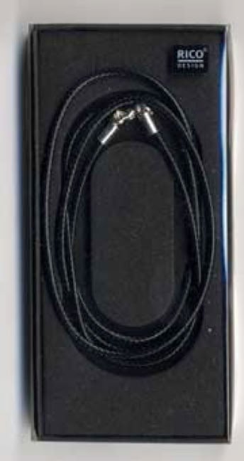 Passend dazu gibt es die hier gezeigten schwarzen gewachsten Baumwollkordeln mit Verschluss als Kette.