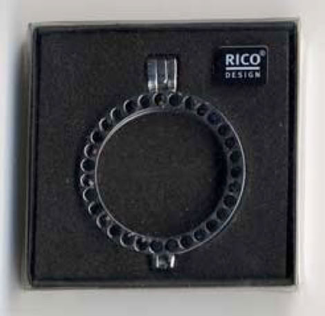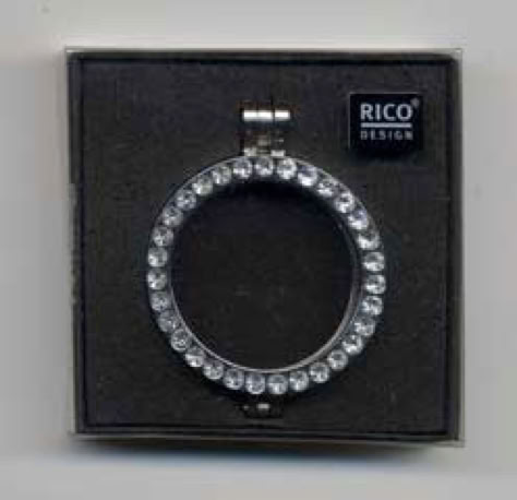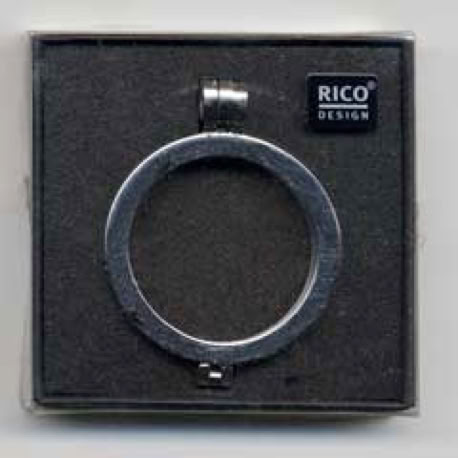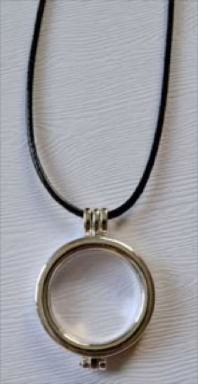 Dieser runde Anhänger zum Gestalten ist so gemacht, dass man innen eine gestaltete Scheibe einlegen kann. Wenn eine Kette durch den Aufhänger gezogen wird ist der Rahmen geschlossen. Der Aufhänger hat ein Glas.