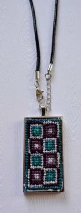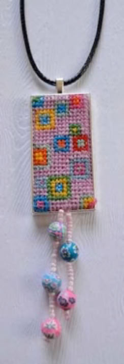 Weil bei mir alles bestickt wird, sticke ich kleine einfache Kreuzsticharbeiten, klebe sie mit doppelseitiger Klebefolie (Aslanfolie) um ein Stückchen Karton, das locker in den Rahmen passt. und klebe das Ganze wiederum mit doppelseitiger Klebefolie in den Aufhänger.