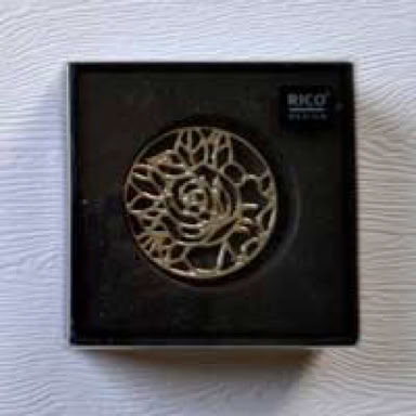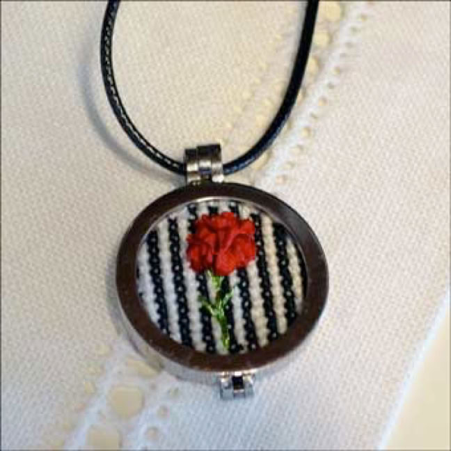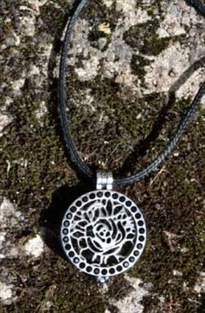 Hier die Rosenscheibe im Anhänger mit schwarzen Strasssteinen + Baumwollkette