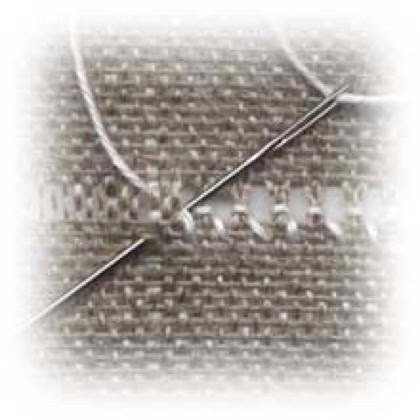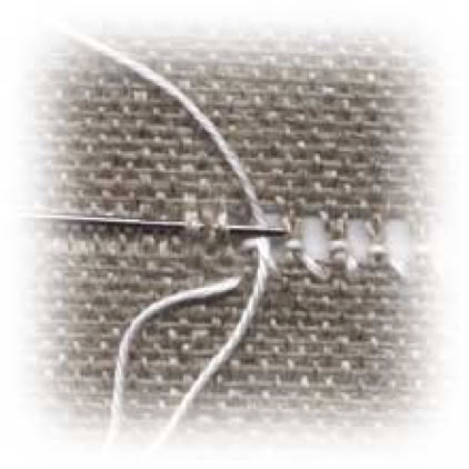 Nun ist der Rhythmus so: Fäden umfassen, kleiner senkrechter Stich, Fäden umfassen, kleiner senkrechter Stich.