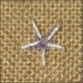 Zuerst einen 5strahligen Stern sticken und dann von inen nach außen mit Seidenbändchen umsstopfen / umweben.