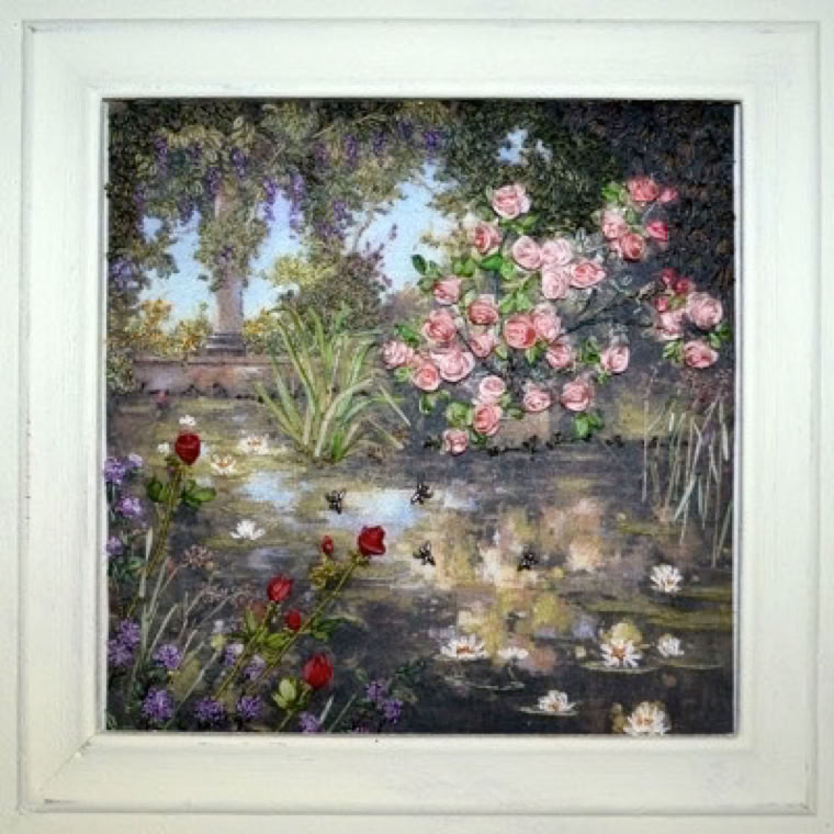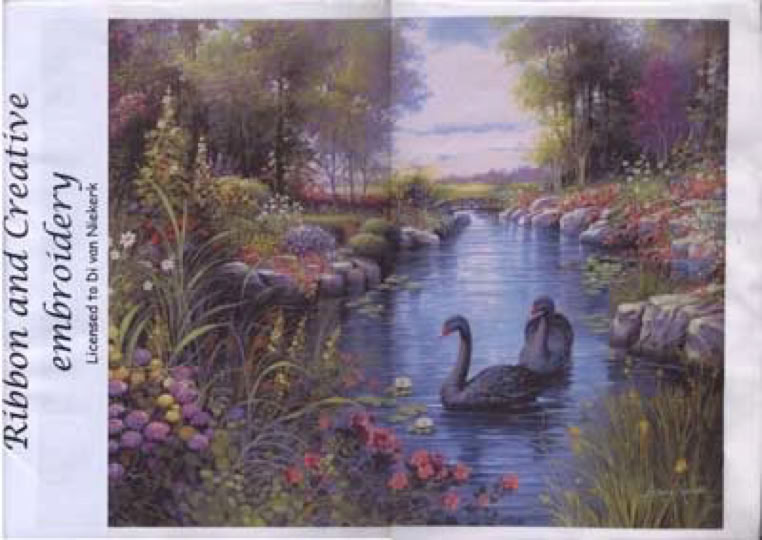 Die Bilder dieser Seite sind auf Baumwollstoff (100% Baumwolle) gedruckt und werden nach Belieben überstickt mit Seidenbändchen und freien Stickstichen. Teile des Motivs bleiben unbestickt.