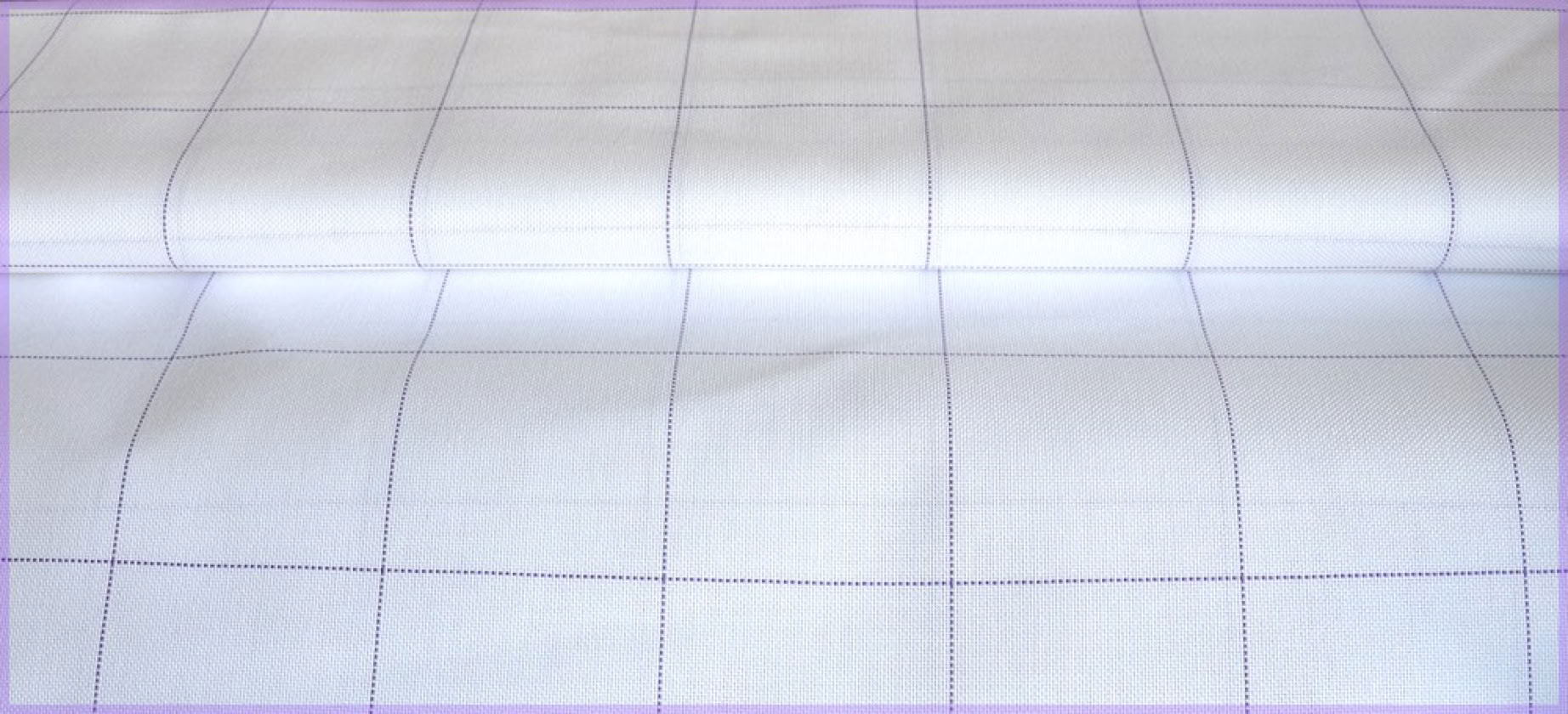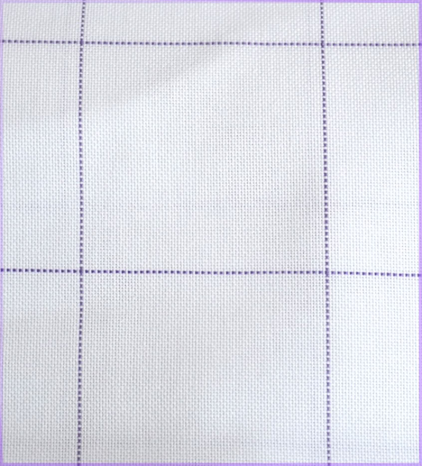 weißer doppelfädiger Zählstoff mit 9 Fäden/cm und schmaler Karo Einteilung in lila. Größe eines Karofeldes ca 9x9 cm.
