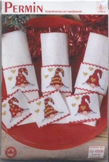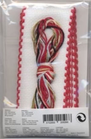 Komplette Stickpackung mit ca 90cm Aidaband weiß (100%Baumwolle) mit roter Kante ca 5cm breit für 6 Serviettenringe, DMC Sticktwist (100% Baumwolle), Sticknadel, Zählmuster und Anleitung. Die Serviettenringe müssen selbst gestickt und genäht werden.