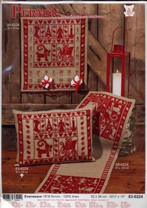 Komplette Stickpackung mit grobem dunklem Leinen ( 100% Leinen, 8 Fäden/cm) als Stickuntergrund, rotes Perlgarn (100% Baumwolle), Sticknadel, Zählmuster und Anleitung. Das Kissen muss selbst gestickt und genäht werden.